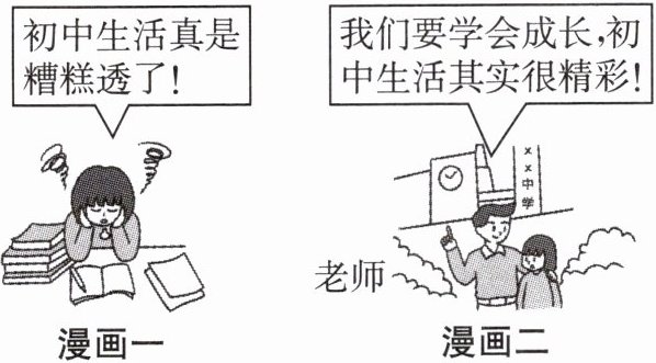 ①漫画一中的同学认为初中生活糟糕透了,是因为她还不能适应初中生活。②漫画二中老师的观点表明初中阶段为我们的发展提供了新的机会,让我们在新的集体生活中,涵养品格,提升自我。初中阶段对我们的人生具有独特的价值,我们要珍视当下,把握机遇,在担当中历练,在尽责中成长,努力使自己成为适应时代发展的有理想、敢担当、能吃苦、肯奋斗的中学生。