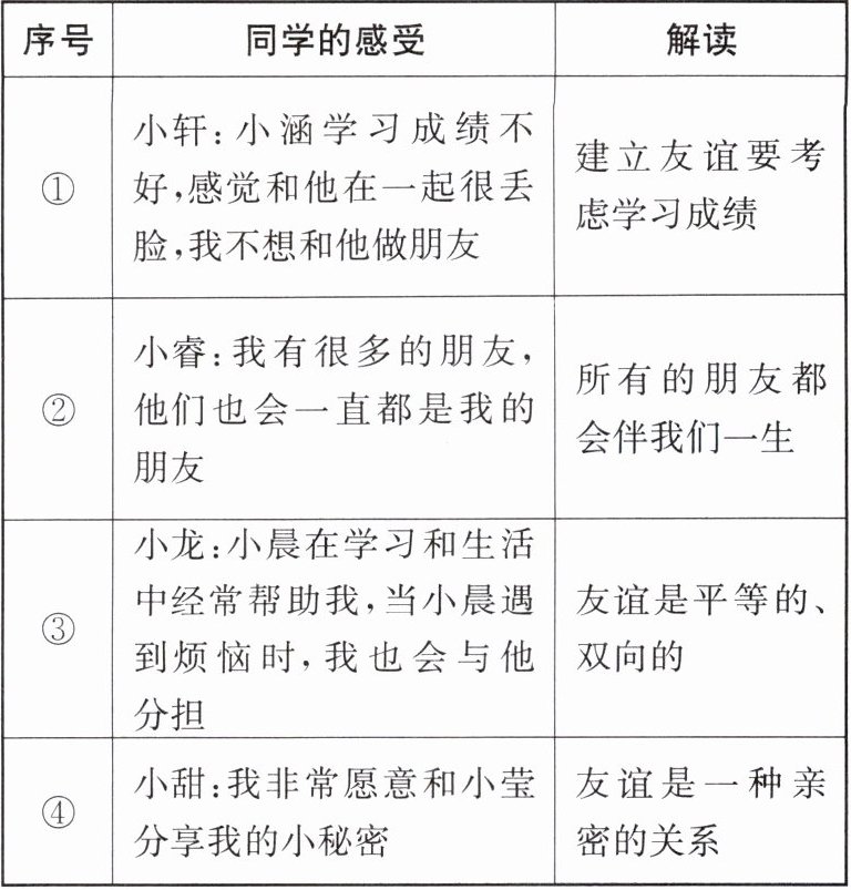 3. 在以“友谊之树常青”为主题的班会上,同学们分享了自己与朋友相处的感受。表格中对同学们的感受解读正确的有( )