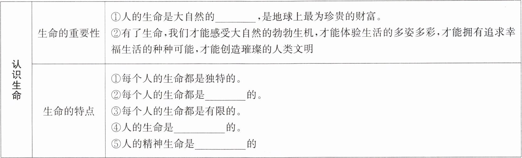| |生命的特点|①每个人的生命都是独特的。②每个人的生命都是______的。③每个人的生命都是有限的。④人的生命是______的。⑤人的精神生命是______的|
