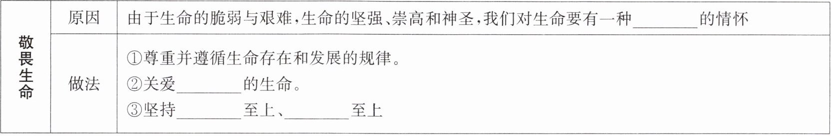 1.①生命是脆弱与艰难的,又是坚强、崇高和神圣的。②生命是最宝贵的,生命重于泰山,每个人的生命都比金钱、权势等身外之物更为重要。③我们既要珍惜自己的生命,又要关爱他人的生命,谨慎地对待生命关系、处理生命问题,尊重、关怀和善待他人。2.①我们要坚持生命至上,懂得敬畏生命。②“仁者爱人”“推己及人”,我们既要珍惜自己的生命,又要关爱他人的生命,谨慎地对待生命关系、处理生命问题,尊重、关怀和善待他人。3.坚持生命至上、敬畏生命等。