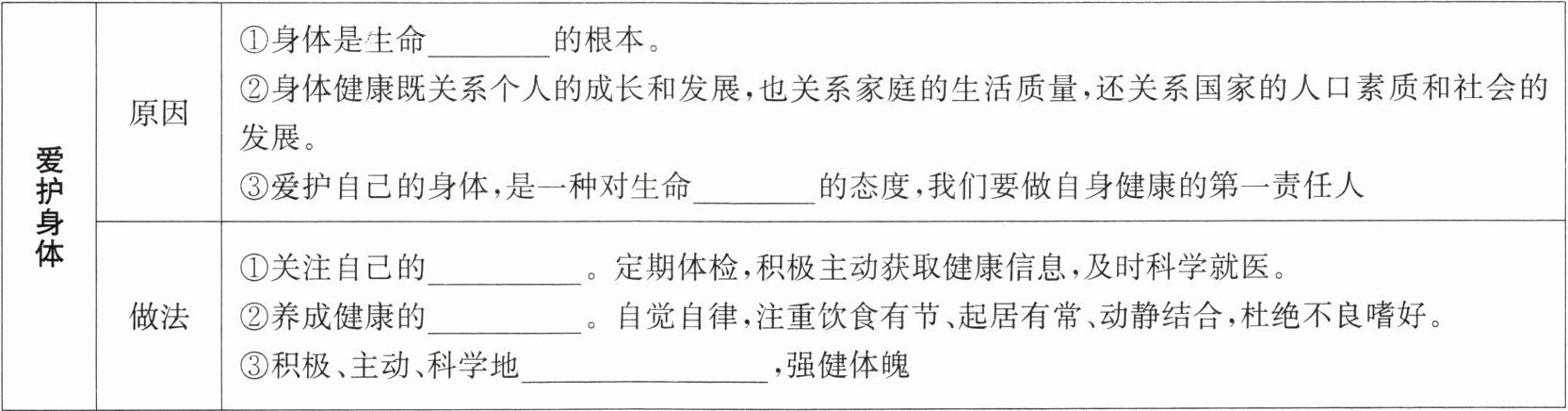 |爱护身体|原因|①身体是生命______的根本。②身体健康既关系个人的成长和发展,也关系家庭的生活质量,还关系国家的人口素质和社会的发展。③爱护自己的身体,是一种对生命______的态度,我们要做自身健康的第一责任人|