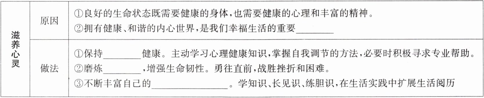 | 滋养心灵 | 原因 | ①良好的生命状态既需要健康的身体,也需要健康的心理和丰富的精神。②拥有健康、和谐的内心世界,是我们幸福生活的重要______ |