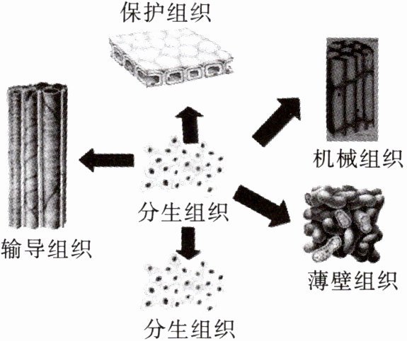 (2)①在成熟的植物体内,总保留着一部分不分化的细胞,它们终生保持分裂能力,由这样的细胞群构成的组织,叫作分生组织。②分生组织主要分布在根尖、芽尖等部位。
