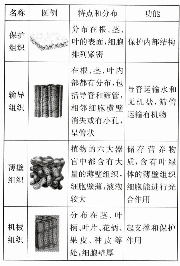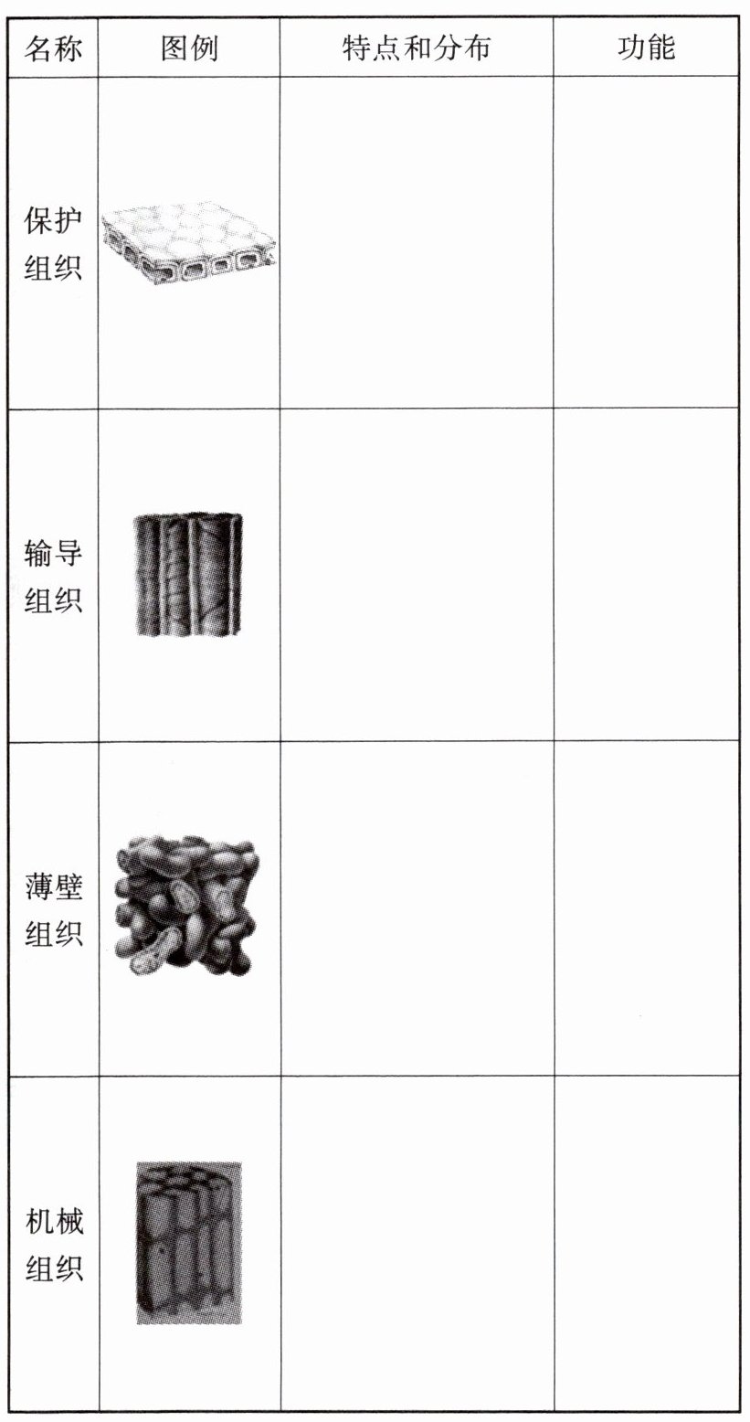 (5)简述这些植物组织的结构特点以及分布情况?根据植物组织的结构判断,这些组织分别具有什么功能?请完成下表。