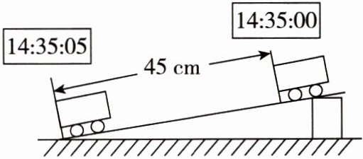 解:由图可知,小车运动的路程s=45cm,运动的时间t=14:35:05-14:35:00=5s。