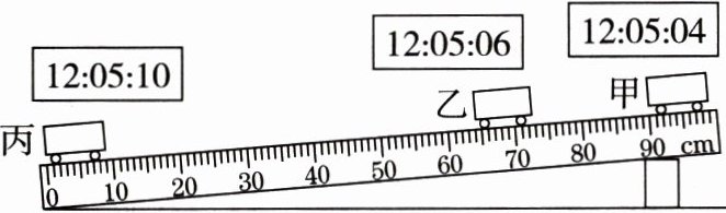 4. 某物理小组利用带有刻度尺的斜面、小车、和电子表测量小车的平均速度,测量过程中小车在甲、乙、丙三个位置所对应的电子表示数如图所示,电子表显示的时间格式是“时:分:秒”。