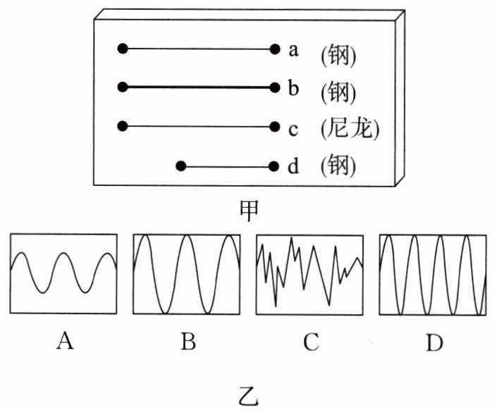 10.某研究小组利用一些长短、粗细、材料不同的琴弦,进行探究音调和哪些因素有关的活动,他们选用的琴弦长度、材料如图甲所示,其中琴弦的直径关系为$d_{a}= d_{c}= d_{d}<d_{b}$,并且每根琴弦的松紧程度一致。
