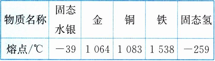 | 物质名称 | 固态水银 | 金 | 铜 | 铁 | 固态氢 |