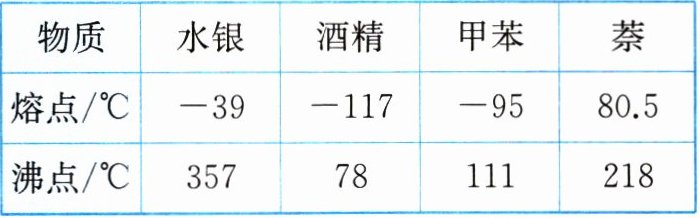 | 物质 | 水银 | 酒精 | 甲苯 | 萘 |