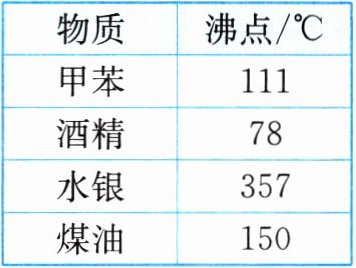 解:液体沸腾条件:达到沸点且继续吸热。标准大气压下,水的沸点为100℃。乙容器内水不能沸腾,说明甲容器中液体沸点不高于100℃,无法使乙中水达到沸点并持续吸热。表格中酒精沸点78℃<100℃,符合条件。