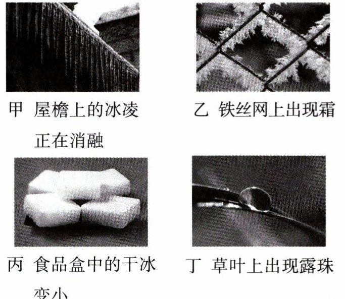 丙图食品盒中的干冰变小,是干冰由固态直接变为气态,属于升华现象,升华吸热。