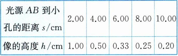 (2)分析表格中的数据,可以发现像的高度$h$与光源到小孔的距离$s$的乘积是一个定值,这里$h$与$s$成反比关系,通过计算可得出具体的关系式。