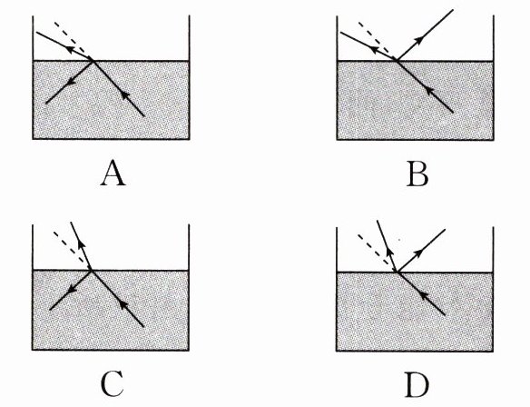 解:根据光的折射定律,光从空气斜射入水中时,折射角小于入射角;当光沿原折射光线从水中斜射到水面时,会发生折射和反射,此时折射角等于原来的入射角,反射角等于入射角。原入射光在空气中,折射光在水中,现入射光为水中原折射光,故折射光应沿空气中原入射光的反方向,且反射光在水中,与入射光分居法线两侧,反射角等于入射角。观察选项,D选项符合上述规律。