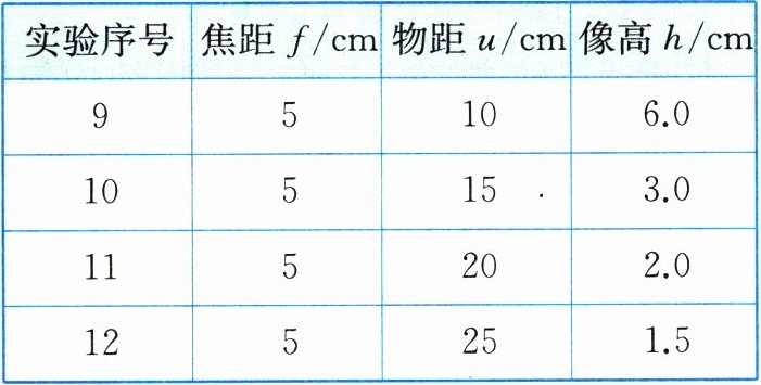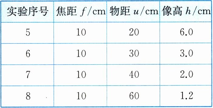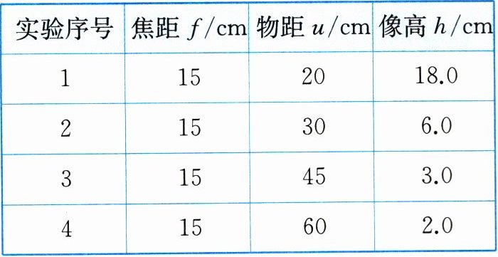 |实验序号|焦距f/cm|物距u/cm|像高h/cm|