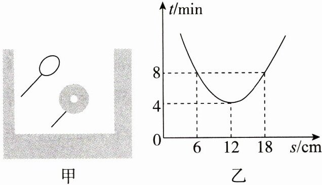 (1)测量焦距时如图甲所示,镜面垂直于阳光,在透镜下面放上白纸(纸、镜平行),测出透镜与白纸间距s与对应的白纸被烤焦的时间t,绘出图像如图乙所示,可判断该透镜的焦距f为