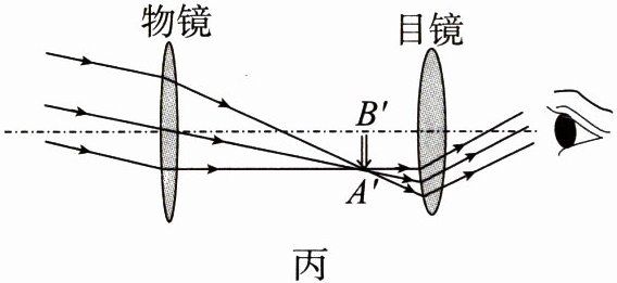 第二,为了大致确定所需纸筒的长度,他们温习了望远镜成像的原理,如图丙所示。