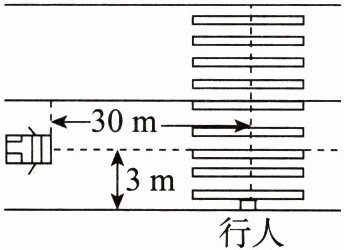 9.研究发现,人在饮酒后驾车的反应时间是未饮酒时的2~3倍。反应时间是指司机从看到意外情况到踩刹车的这段时间;在反应时间内汽车保持原来的速度前进一段距离,这段距离叫反应距离。如图所示,某人酒后驾车沿马路直线行驶,车头中央距马路边缘3 m,车在到达某位置时,司机发现一人正从路边出发闯红灯通过人行横道,此时汽车的速度为15 m/s,距离人的行走路线为30 m,已知该司机的反应时间为1.2 s,刹车后汽车不能立即停下来,再经过1 s刚好行驶到人的行走路线。