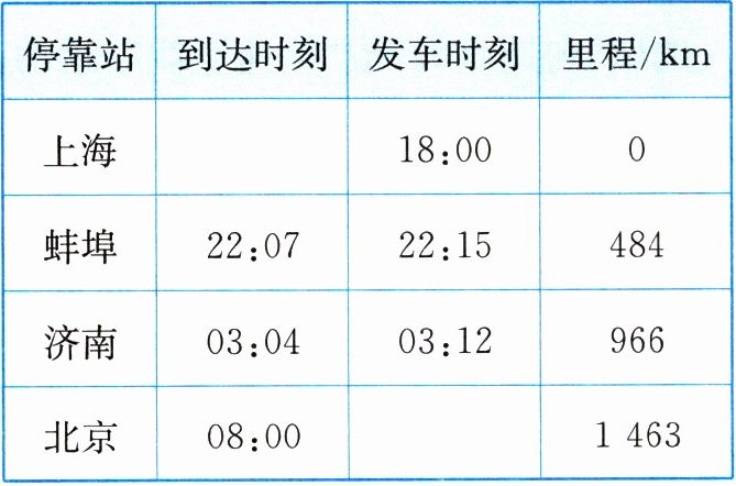 解:列车从蚌埠发车时刻为22:15,到达济南时刻为03:04。