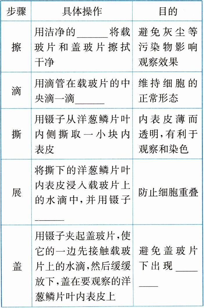 |防止细胞重叠||盖|用镊子夹起盖玻片,使它的一边先接触载玻片上的水滴,然后缓缓放下,盖在要观察的洋葱鳞片叶内表皮上|避免盖玻片下出现