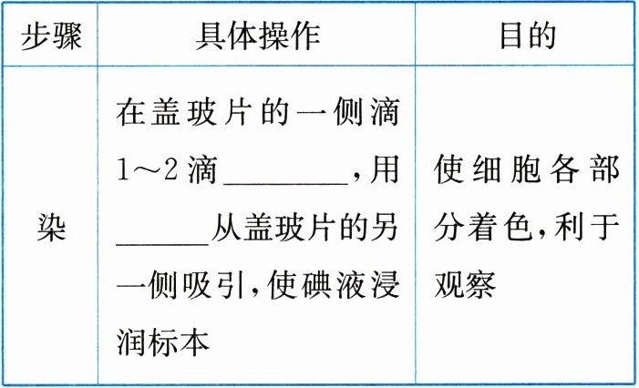 从盖玻片的另一侧吸引,使碘液浸润标本|使细胞各部分着色,利于观察|2.尝试制作其他植物细胞临时装片