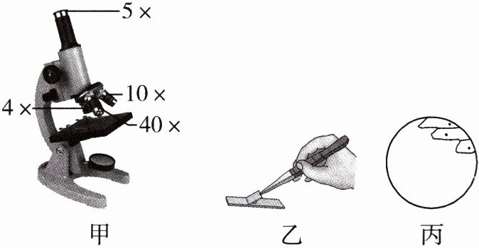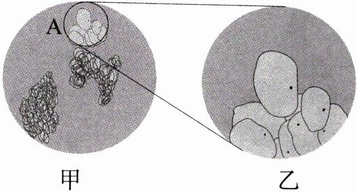 (2)小明又用解剖针挑取叶柄的肉质部分制成临时装片进行观察,结果如图甲所示。为进一步观察图甲中的A处细胞,他需要先移动临时装片将A处细胞移至