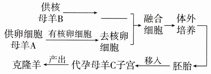 供卵细胞母羊A→有核卵细胞→去核卵细胞}→融合细胞→体外培养→胚胎→移入代孕母羊C子宫→产出克隆羊