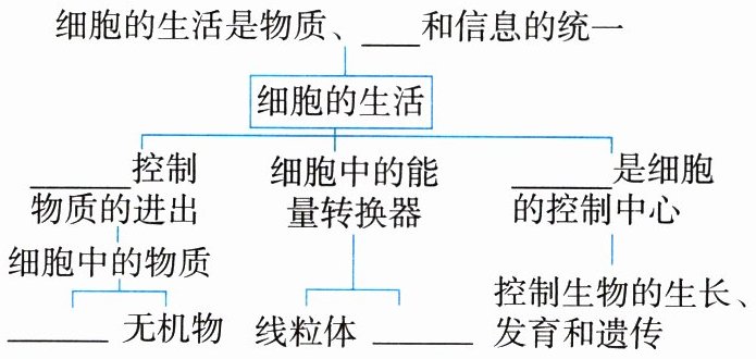 对于“细胞的生活是物质、____和信息的统一”,根据所学知识,细胞的生活需要物质、能量和信息,所以此处应填能量。