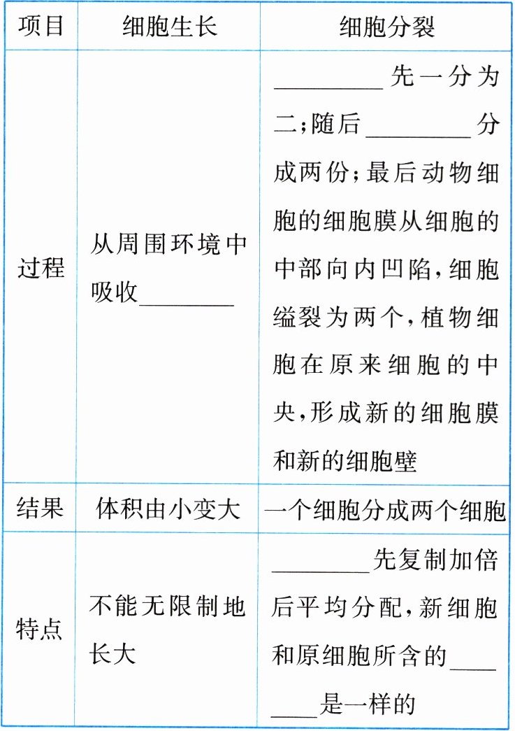 分成两份;最后动物细胞的细胞膜从细胞的中部向内凹陷,细胞缢裂为两个,植物细胞在原来细胞的中央,形成新的细胞膜和新的细胞壁 || 结果 | 体积由小变大 | 一个细胞分成两个细胞 |