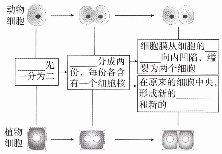 对于细胞分裂过程,细胞分裂时,细胞核先一分为二;随后细胞质分成两份;最后动物细胞的细胞膜从细胞的中部向内凹陷,细胞缢裂为两个,植物细胞在原来细胞的中央,形成新的细胞膜和新的细胞壁,所以第二、三个空分别填“细胞核”“细胞质”。