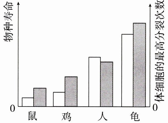 (2)分析实验二:从图中可以看出,鼠、鸡、人和龟的物种寿命不同,体细胞的最高分裂次数也不同,一般来说,寿命越长的物种,体细胞的最高分裂次数的值越大。