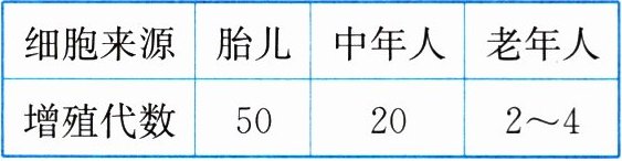 实验一 分别在相同的条件下,体外培养胎儿、中年人和老年人的肺的纤维细胞,结果如下表所示。