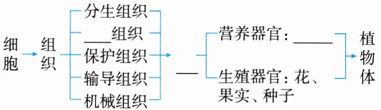 【解析】:本题考查植物体的结构层次中组织和器官的相关知识。植物的组织主要有分生组织、营养组织、保护组织、输导组织和机械组织等。其中营养组织具有储存营养物质等功能。植物的器官分为营养器官和生殖器官,营养器官包括根、茎、叶,它们与植物的营养生长有关;生殖器官包括花、果实、种子,与植物的生殖有关。