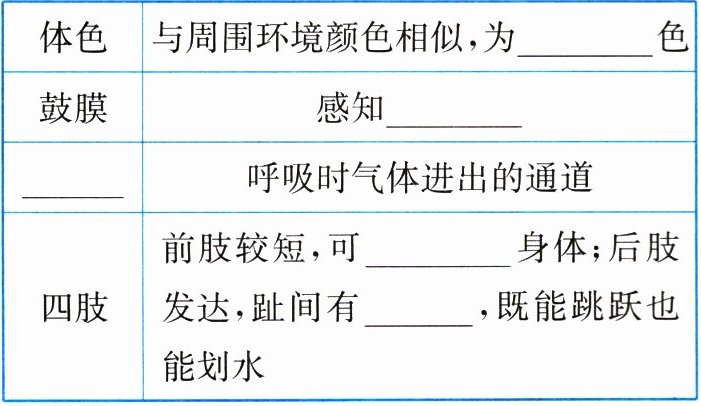 (1)青蛙的体色与周围环境颜色相似,这种体色为保护色,有利于青蛙躲避敌害和捕食。鼓膜是青蛙感知声波的器官。青蛙呼吸时气体进出的通道是鼻孔。青蛙的前肢较短,可支撑身体;后肢发达,趾间有蹼,这种结构特点使得青蛙既能跳跃也能划水。