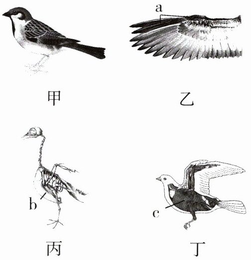 ,是鸟的飞行器官,上面生有成排的大型羽毛。③骨骼:图丙是鸟的骨骼示意图,鸟的骨骼轻、