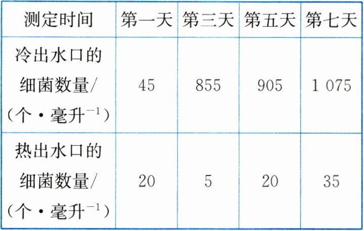 |冷出水口的细菌数量/(个·毫升$⁻^1)$|45|855|905|1075|