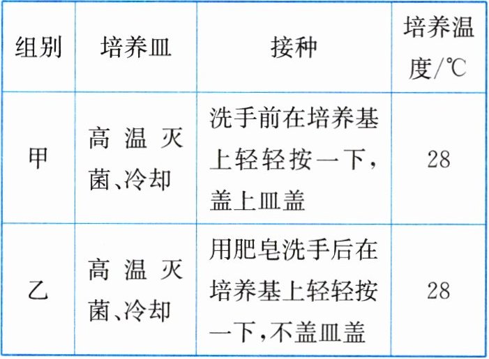 |甲|高温灭菌、冷却|洗手前在培养基上轻轻按一下,盖上皿盖|28|