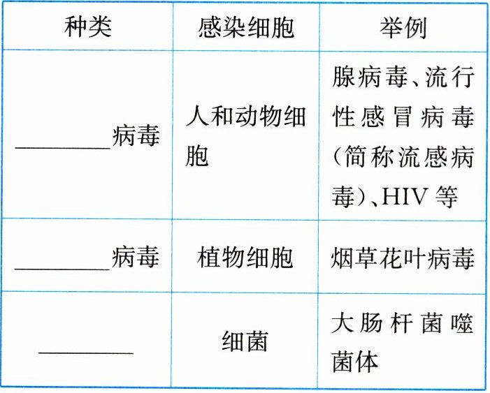 病毒 | 人和动物细胞 | 腺病毒、流行性感冒病毒(简称流感病毒)、HIV等 ||