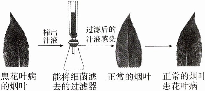 A选项:从实验中可以看到,将患病烟叶的汁液通过能将细菌滤去的过滤器后,依然能使正常烟叶患病,这说明引起正常烟叶患病的不是细菌,A选项错误。