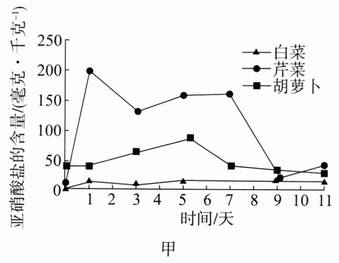 3.泡菜是我国的一种特色食物,但是传统泡菜的制作过程会产生亚硝酸盐(一种公认的致癌物质),危害人体健康。某生物学兴趣小组的同学尝试制作泡菜,并进行了亚硝酸盐含量的测定(亚硝酸盐的含量与腌制时间、盐浓度、温度等众多因素密切相关),并将亚硝酸盐含量随时间变化的结果绘制成曲线图(如图甲所示)。请回答下列问题。