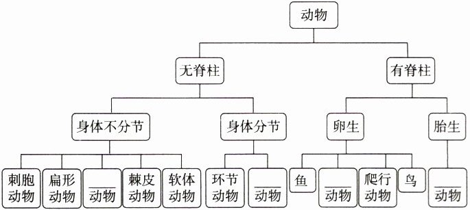 【解析】:本题主要考察对动物分类知识的掌握。第一小问:动物的分类除了要比较外部形态结构,如动物的体型、颜色、附肢等特征,还要比较它们的生理功能,如消化方式、呼吸方式、循环方式等,以及生殖方式,如卵生、胎生等。第二小问:根据动物的身体是否分节、有无脊柱以及生殖方式等特征进行分类。在无脊柱动物中,身体不分节的动物除了刺胞动物、扁形动物外,还有线形动物;在无脊柱动物中,身体分节的动物有环节动物和节肢动物;在有脊柱动物中,卵生动物除了鱼类、爬行动物、鸟类外,还有两栖动物;在有脊柱动物中,胎生的是哺乳动物。