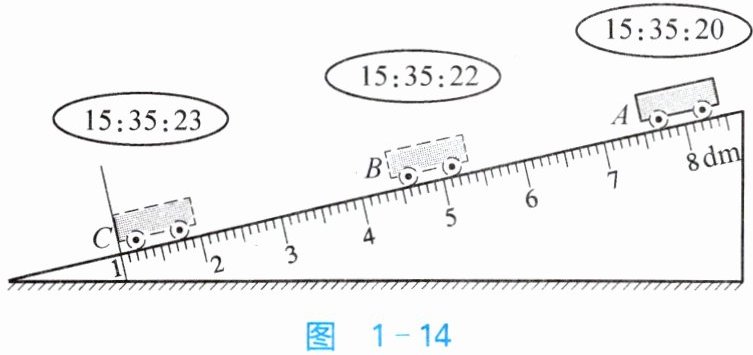 4. 小明在“测小车的平均速度”的实验中,设计如图1-14所示的装置:小车从带有刻度(分度值为1 cm)的斜面顶端由静止开始沿斜面运动,图中圈内是小车到达A、B、C三处时电子表显示的时刻(数字表示“时:分:秒”)。