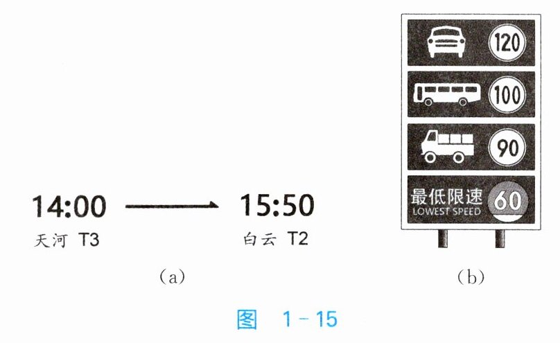 (2) 广州白云机场距离深圳市区约160 km,高速限速如图1-15(b)所示,若大巴车以最快速度行驶,则小丽从广州返回深圳至少需要多少时间?