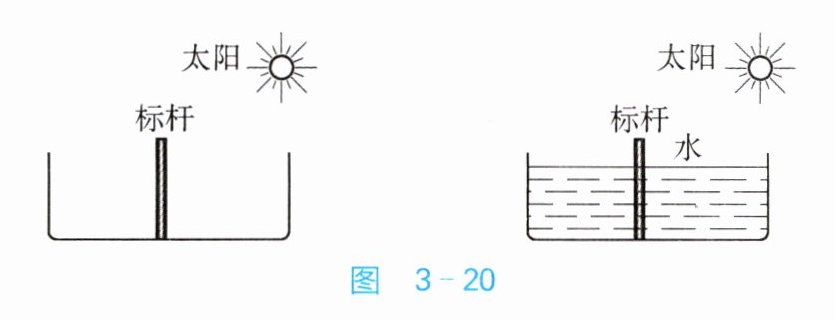 10. 如图3-20所示,两个并排而且深度相同的水池,一个装水,另一个未装水。在两池的中央各竖立着一根比池深略高的标杆,且两根标杆长度相同。当阳光斜照时就会在池底形成标杆的影子,下列说法正确的是(