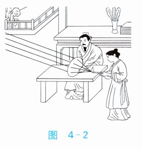 2. 如图 4-2 所示,西汉时期的《淮南万毕术》中记载,“削冰令圆,举以向日,以艾承其影,则火生”。请你用学过的光学知识判断,“削冰令圆”就是把冰块制成