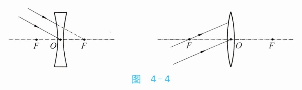 4. 如图 4-4 所示,两条入射光线(或延长线)分别过透镜的光心 O 和焦点 F,分别画出经过透镜折射后的光线。