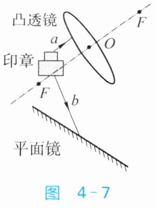 8. 图 4-7 所示是博物馆内“刘充国印”的展台的示意图,上方是凸透镜,透过它能看到放大的印章;下方是平面镜,通过它能看到印章底部的字。其中,F 为凸透镜的焦点,O 为凸透镜的光心,光线 a 平行于凸透镜的主光轴。请在图中画出:(1)光线 a 经过凸透镜折射后的光线;(2)光线 b 经过平面镜反射后的光线。