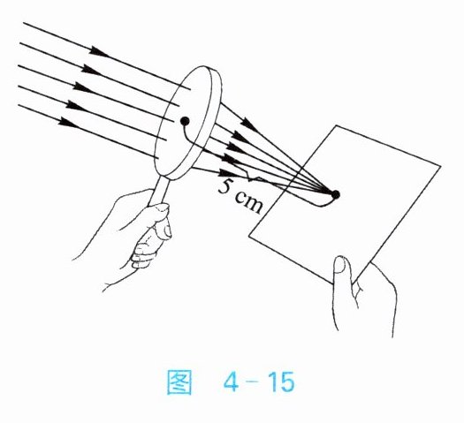 (1)测焦距:如图4-15所示,让凸透镜正对着太阳光,在它的另一侧找到最小最亮的光斑,说明凸透镜对光具有