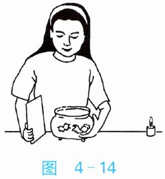 6. 小红在家中用纸屏、盛水的圆形鱼缸、点燃的蜡烛组成了一个实验装置,如图4-14所示,盛水的圆形鱼缸相当于一个
