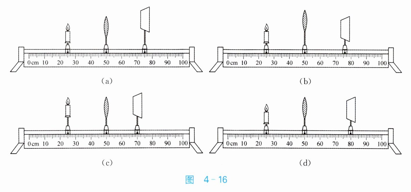 (2)组装实验装置:将蜡烛、凸透镜和光屏放在光具座上,并对三者进行调节,图4-16所示是四位同学分别调节完的实验装置,其中调节正确的是图