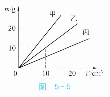 例 2 甲、乙、丙三种物质的质量与体积的关系如图5-5所示,$\rho_甲$、$\rho_乙$、$\rho_丙$、$\rho_水$分别代表甲、乙、丙三种物质和水的密度,下列说法正确的是($\rho_水= 1.0×10^3\ kg/m^3$)(